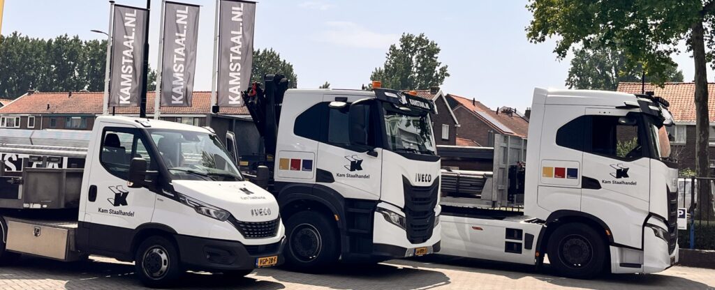 Kam Staalhandel kenmerkt zich door servicegerichtheid, flexibiliteit en zeer korte levertijden en kan – mede door de expertise van zusterbedrijf Kam Metaalbewerking B.V. – het te leveren staal ook bewerkt aanleveren. Vanwege deze vele capaciteiten en mogelijkheden worden de af te leveren hoeveelheden steeds groter en de transporten steeds zwaarder. Daarom hebben wij sinds 2023 een IVECO X-WAY 6×2 bakwagen en in 2024 een Iveco S-Way met trailer aangeschaft om nog beter op de vraag van onze klanten te kunnen inspelen. Deze beide vrachtwagens zijn door een gezamenlijke locale inspanning van IVECO Schouten te Alblasserdam – Dubbeldam te Zwijndrecht & Ruizeveld te ‘s Gravendeel tot stand gekomen.